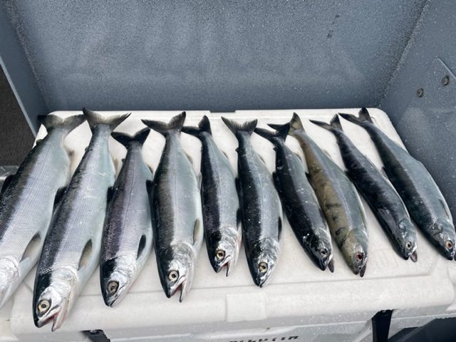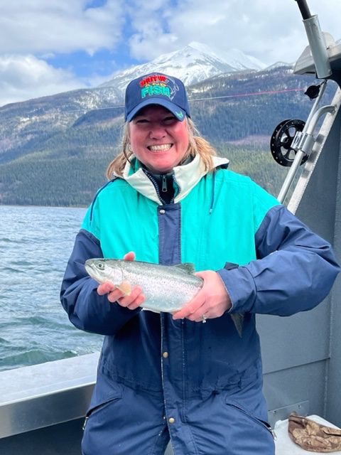 On the downrigger, we are starting to get a few good Bull Trout. Our favourite STS flasher with green pistachio or spatter back hoochie have been working best. While we were catching fish down 120 – 150ft before, we are now starting to see more fish in the 50 -60ft range. So, don’t be afraid to mix it up. Start with riggers at 50 and slowly work down to the 120ft mark.
