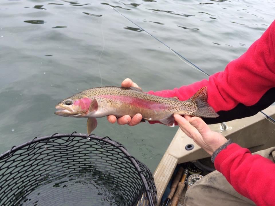 Seems like most of the fish are hanging out deep while not active. So, we have managed to hook a few good ones on the down rigger when we happen to put it in their face. Don’t be afraid to fish deep. (150ft and deeper). And, when the Rainbows decide to feed, we are catching most of them on the surface. So, mix it up a bit.