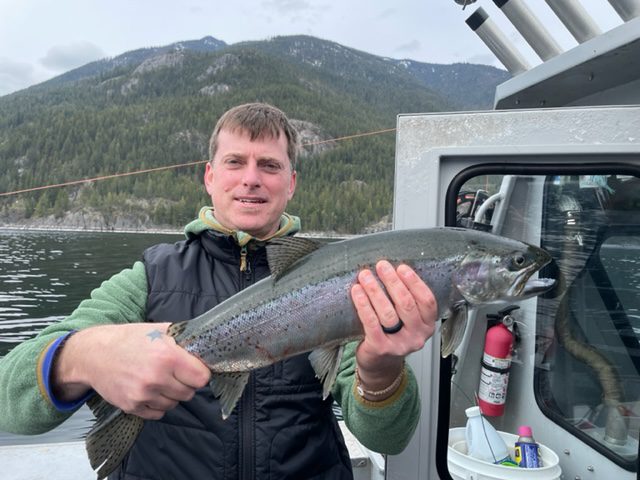 Most of April saw some cooler weather and water, and the fishing was hot and cold. But, the past week or so the water has started to warm and we are seeing more fish coming to the surface. Rainbows up to 4 Lbs and Bull Trout up to 10 Lbs have been coming in lately. The top 3 Bull Trout in the Easter derby were between 5 – 10 Lbs.